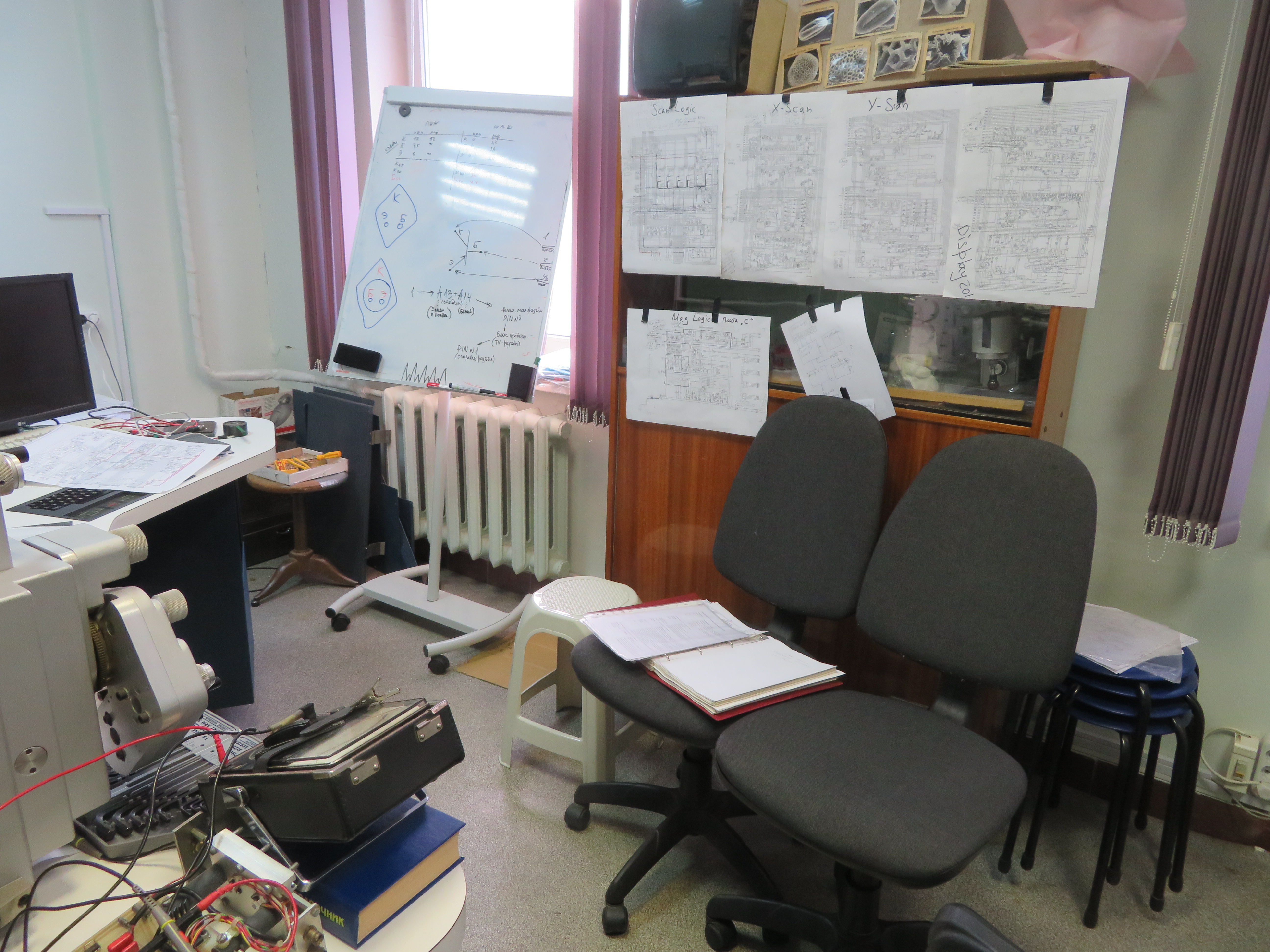 Провода с оплавленной изоляцией я заменил быстро, но напряжение 55 В, поданное вместо 12 В, повредило многие микросхемы. Нам было чем их заменить - все радиодетали 1990 г выпуска продаются в Чип и Дип - но чтобы найти неисправные надо было заменять их все микросхемы в платах сканирования по очереди колодками, и вставлять в них новые, авось повезет. Это был позорный конец. Чувствуя себя Тарасом Бульбой, я был готов уже на пенсию, но коллектив не позволил. Андрей быстро научил паять Леру Рылееву, Машу Сусленкову и ультратомисток Юлю Дорченкову и Настю Вайгель, и во впаянные ими колодки на платах тут же вставлял новые интегралки. Так платы одна за другой начинали функционировать, и микроскоп стал медленно оживать, возвращаясь к состоянию до моего агрессивного вмешательства. Вся комната 203 была обвешана увеличенными копиями схем, а на доске Андрей рисовал свои... Но высокое напряжение так и не нашлось, стало ясно, что ВВ-блок умер. Я позвонил без особой надежды Роману Ракитову и, О, Чудо! Оказалось, что ВВ-блок от списанного Camscan-S4, так и стоит в жарком подвале ПИН РАН с древними ископаемыми костями! Поехали, привезли, подключили, работает!